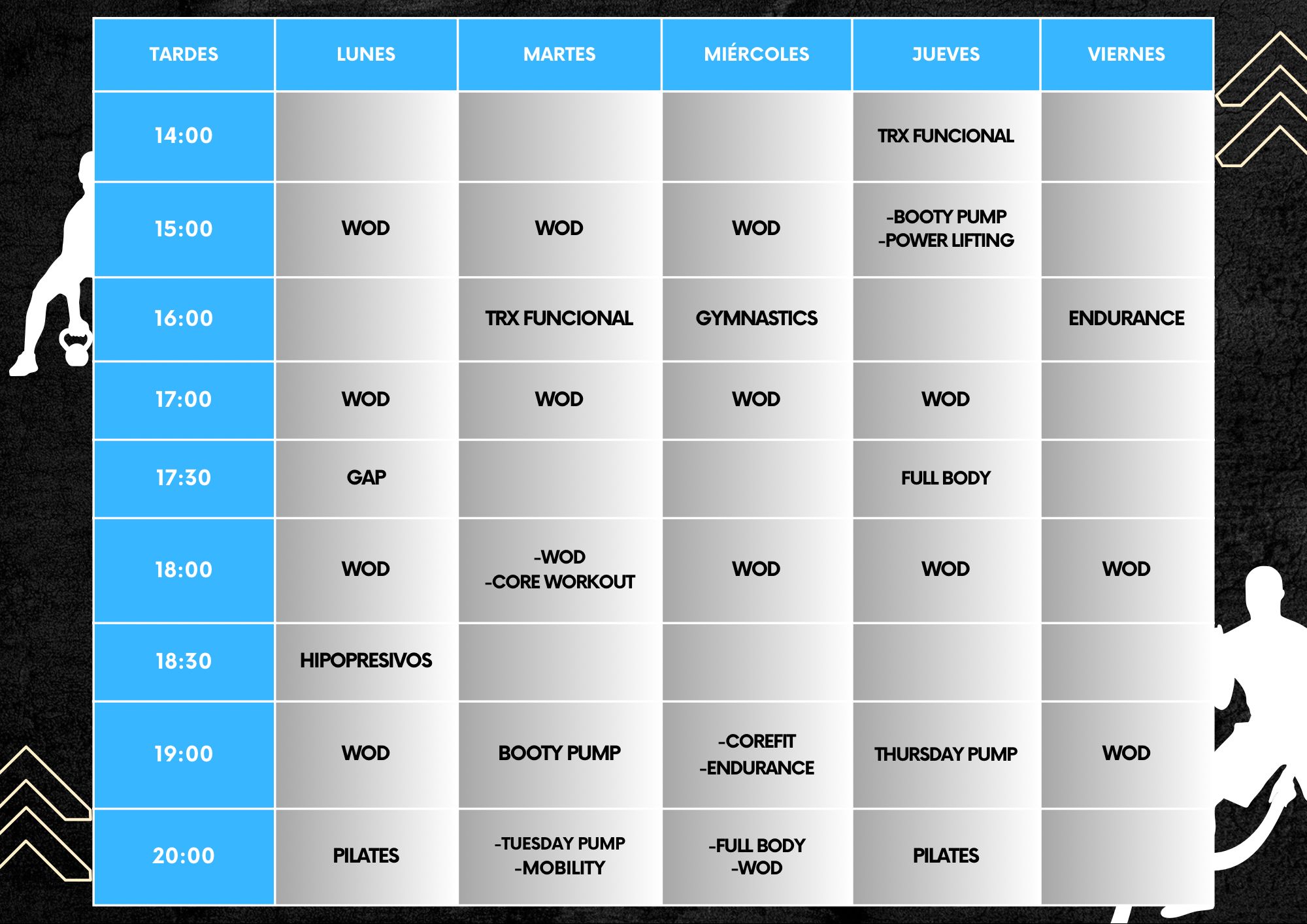 Podrás realizar actividades de CROSS TRANNING, HALTEROFILIA, GIMNASTICS, OPEN BOX, ENDURANCE, PILATES y GAP.